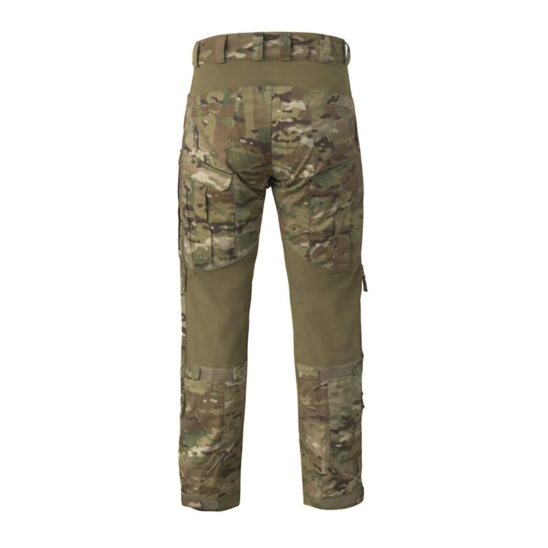В жизненно важных зонах (талия, промежность, задняя часть колен) использованы вставки из материала Versastrech. Он быстро сохнет и обладает высокой воздухопроницаемостью. Область колена усилена тканью Cordura 500D с прорезями для защитных вставок. Благодаря дополнительным завязкам, расположенным под коленом и внизу штанины, брюки легко регулируются по ноге.